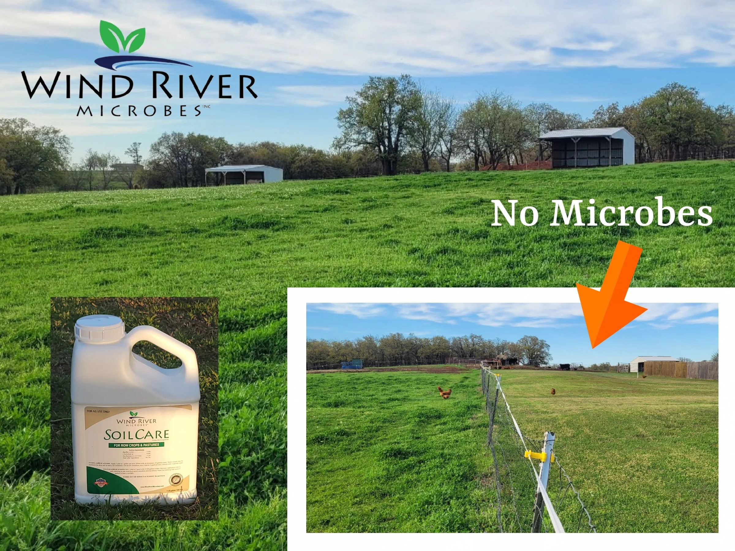 This side-by-side pasture comparison highlights the difference observed after applying SoilCare Formula to the pasture on the left, while the pasture on the right received no biological treatment. Both areas share similar soil type and environmental conditions, yet the treated side demonstrated noticeably thicker forage growth, improved color, and greater overall density. Supporting active soil biology appears to have enhanced nutrient cycling and root development, resulting in stronger pasture performance compared to the untreated ground.