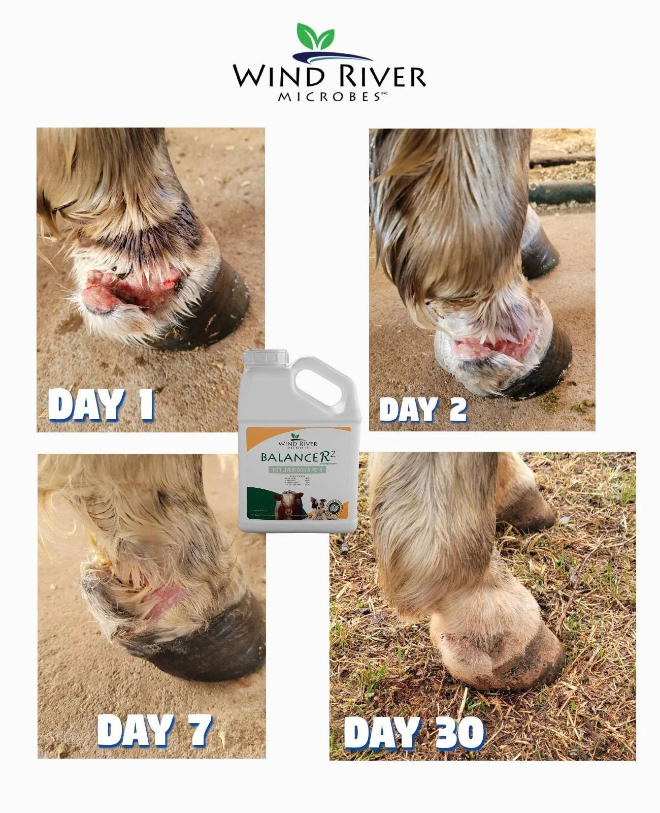 These photos document the progression of a wound on a horses pastern from day one through day thirty. Balancer2 Formula was applied daily to the affected area and the wound was properly wrapped and managed throughout the recovery process. Over the 30-day period, the tissue showed steady improvement with clean granulation and no proud flesh formation. The area progressed without the need for harsh topical chemicals, and consistent daily application supported a smooth and controlled recovery.