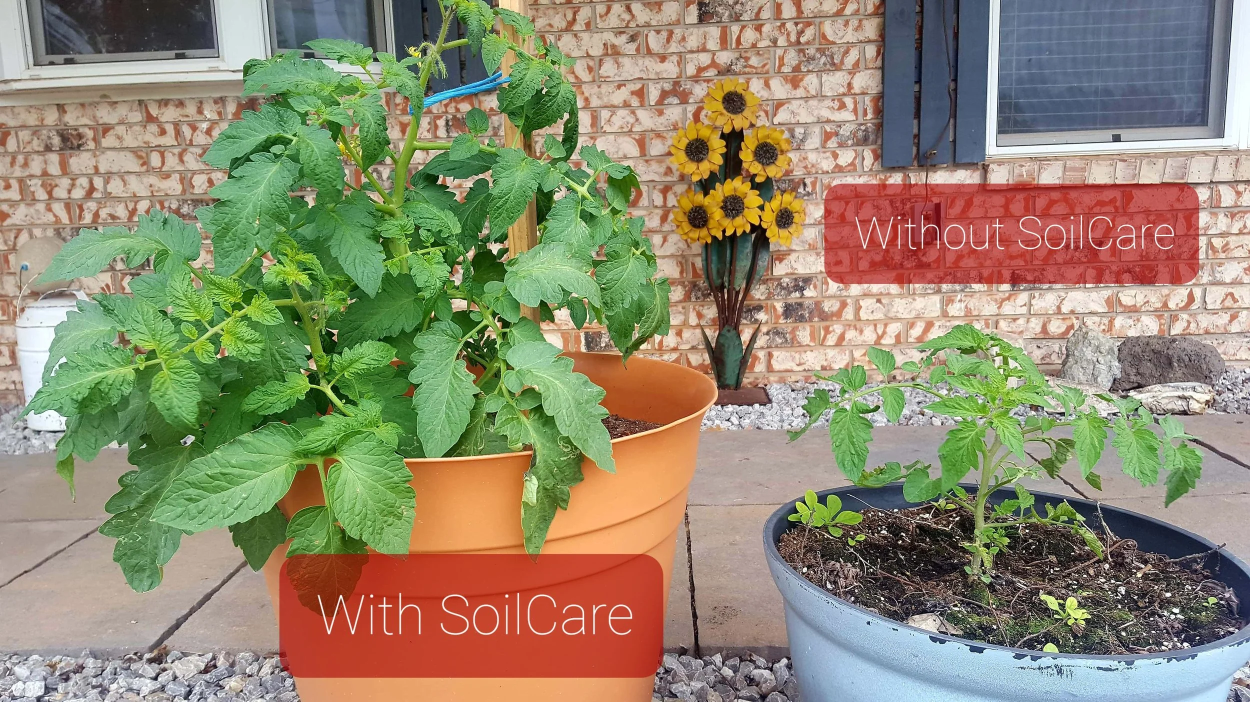 Both tomato plants were started from seed at the same time and grown under similar conditions. The plant on the left received an application of SoilCare Formula to the soil, while the plant on the right did not. Over the growing period, the treated plant demonstrated noticeably stronger growth and development. Supporting active soil biology through SoilCare appears to have enhanced root function and nutrient availability, resulting in improved plant vigor compared to the untreated plant.