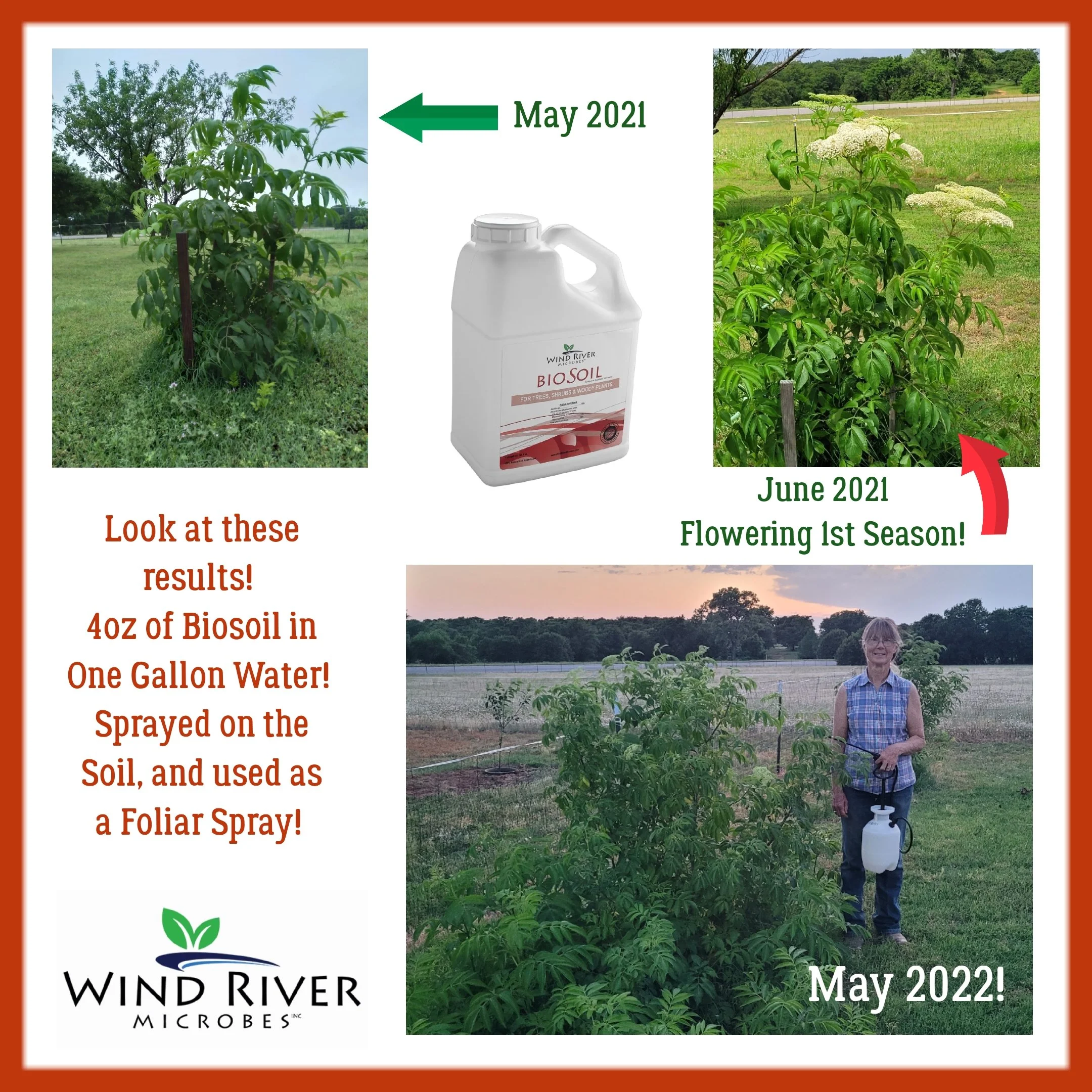 This elderberry plant received an application of BioSoil Formula to the soil during its first growing season. Throughout the season, the plant demonstrated incredible vegetative growth and established more quickly than expected. In addition to substantial size increase, the plant produced flowers during its first year — an outcome not typically observed at this stage of development. Supporting active soil biology appears to have enhanced root establishment and nutrient availability, contributing to accelerated growth.
